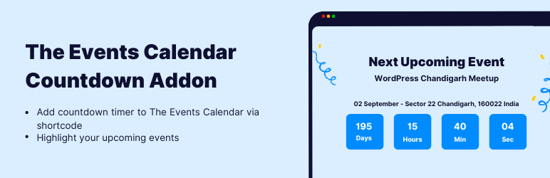 The Events Calendar Countdown shortcode extends the features of The Events Calendar plugin by adding a countdown timer. You can display a countdown for a specific event or let the addon automatically show the countdown for your next upcoming event.