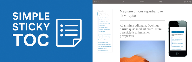 Simple Sticky TOC automatically generates a sticky table of contents for single posts or pages by parsing <h2>, <h3>, and <h4> tags. It is lightweight, mobile-friendly, and works without jQuery.
